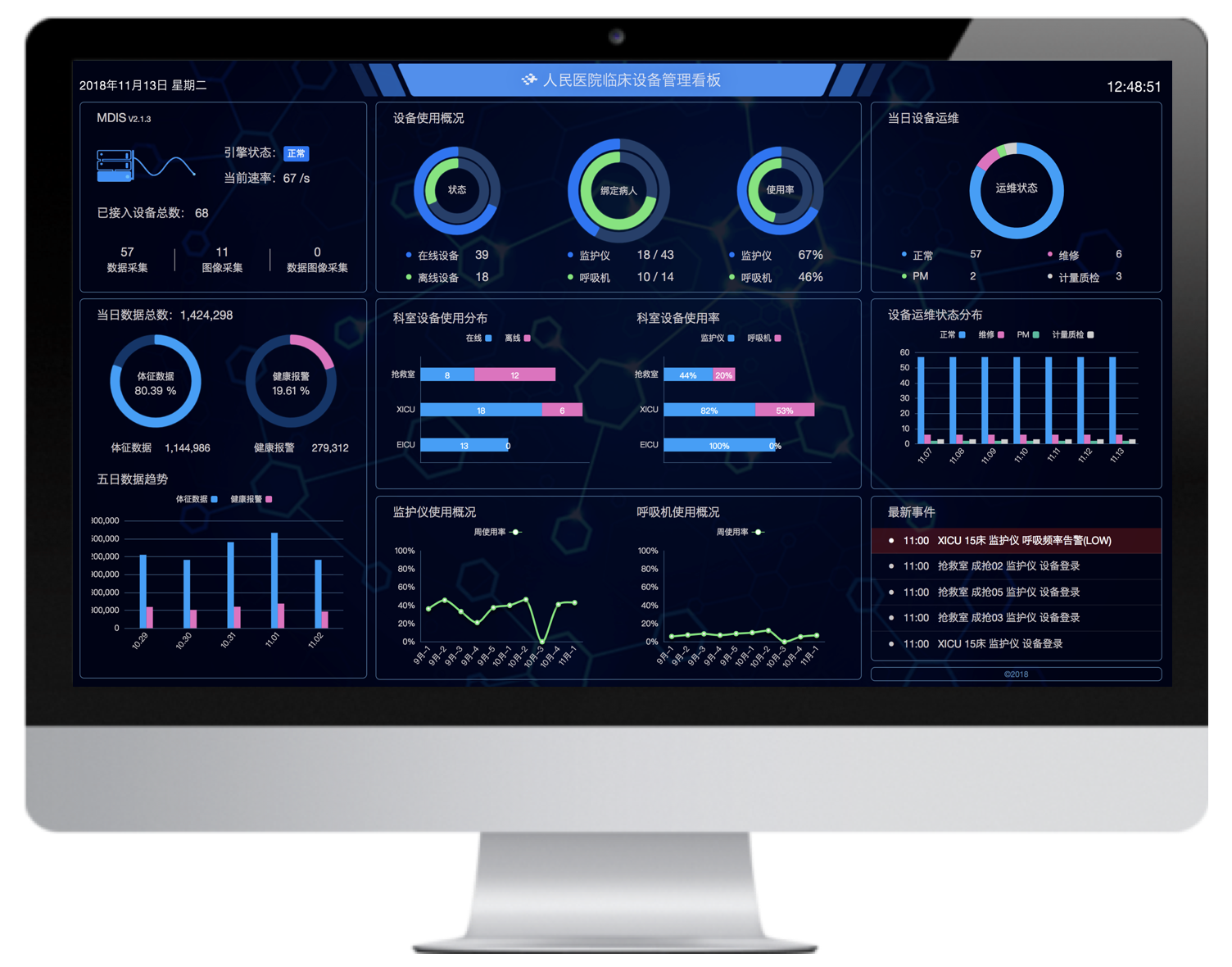 實時顯示數據引擎狀態(tài),數據趨勢、設備使用概況、科室品牌設分布和使用概況、設備運維狀態(tài)、最新運行事件的可視化數據大屏