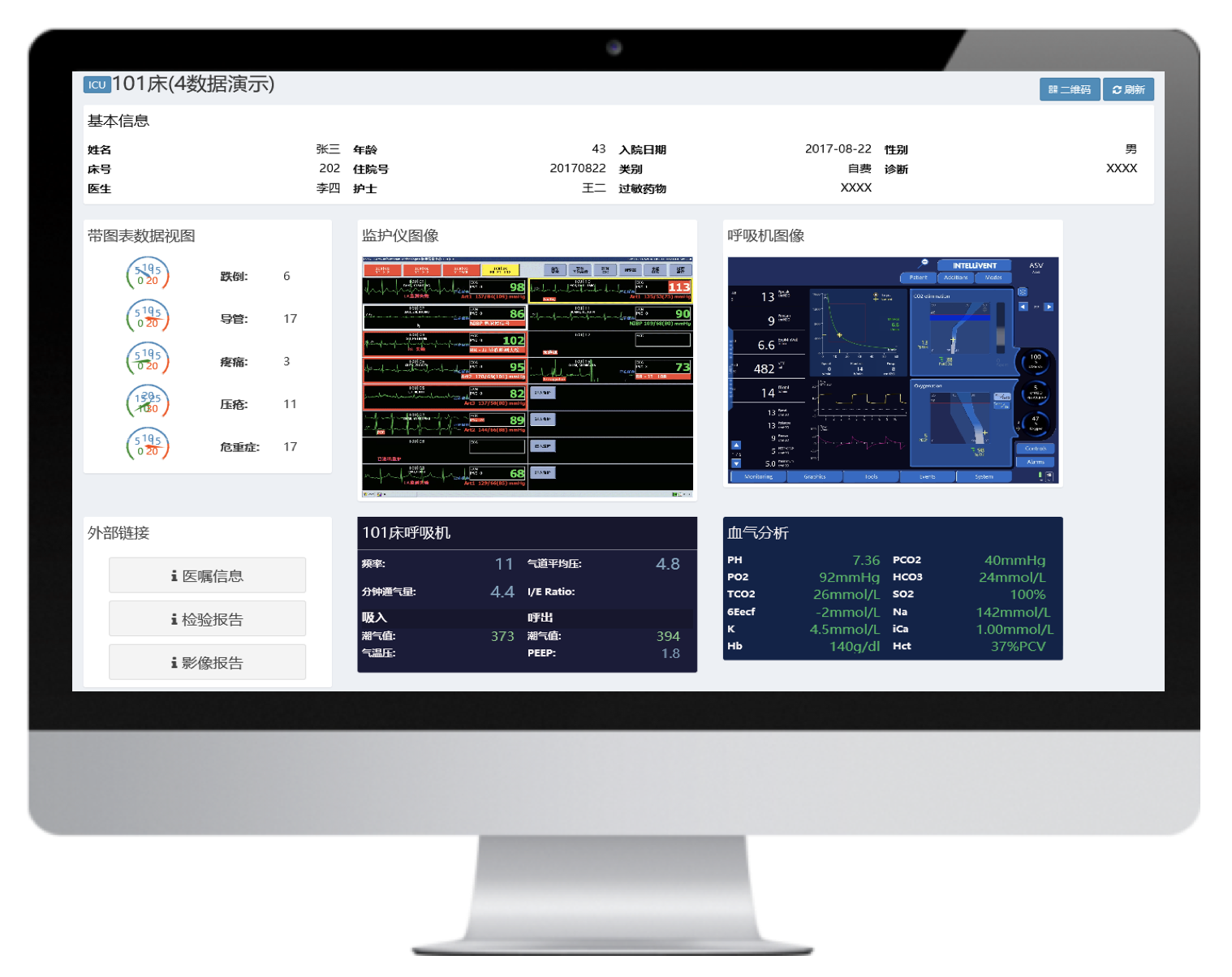 通過的最新的數據采集技術和網絡技術將多臺不同品牌的有創(chuàng)呼吸機聯(lián)網,并通過大屏實時集中呈現(xiàn)治療預設參數和監(jiān)測參數,實現(xiàn)多臺集中監(jiān)測、集中管理和數據存儲。